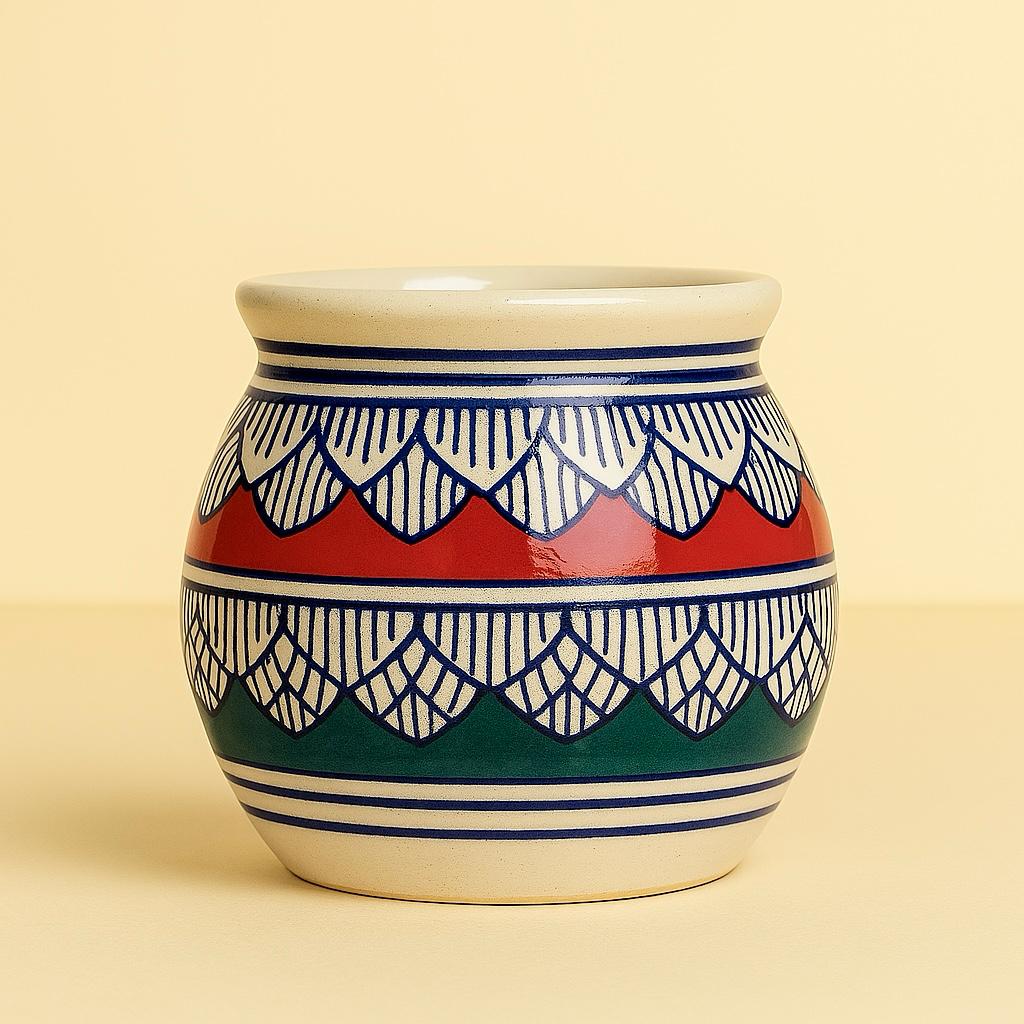 Bring home the charm of traditional artistry with this beautifully handcrafted Ceramic Vase. Designed with intricate hand-painted patterns in vibrant red, green, and blue hues, this terracotta pot reflects the essence of Indian folk art. Perfect as a decor piece or for storing dry items, it adds a rustic yet elegant touch to any space.